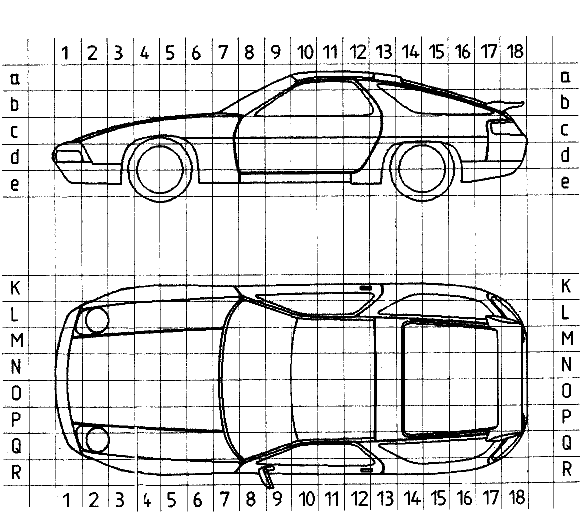 Porsche wiring diagrams are separated into diagram sections and use a coordinate system which divides each section into small fields. Letter coordinates span across the top and bottom of each diagram section and numeric coordinates span down each side of the diagram section. Since wiring often continues from one diagram section to a different diagram section, the alpha-numeric coordinate (5) is used to identify a field in a new diagram section in which a circuit is to be continued. To follow a circuit that continues to a new diagram section, determine the color and size of the wire, identify the new diagram section alpha-numeric coordinate, and go to the field coordinate of the new diagram section. Note that there may be more than one circuit that is continued to this field and you will need the field coordinate from which the circuit was continued and the color code of the wire to identify the correct circuit.